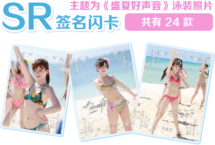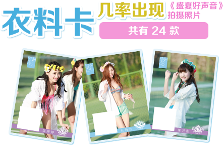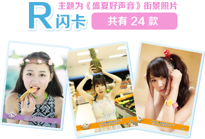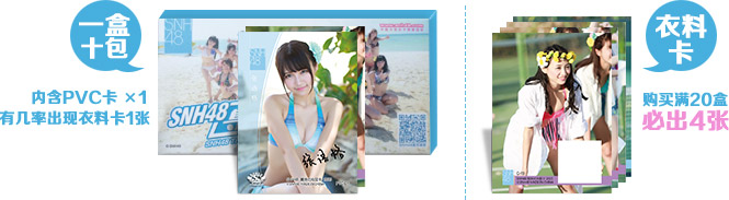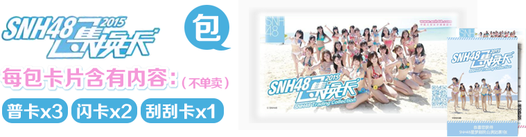 SNH48 2015年集换卡火热上线,对比14年首套集换卡,本次的集换卡无论是在卡种、制作工艺还是图片素材上都有大幅度的提升和改进。针对图片素材,粉丝可将本套集换卡视为SNH48在2015年上半年的重大事件记录合计,不仅收录了《盛夏好声音》拍摄时的成员个人写真素材,以及牵动无数粉丝心跳的“梦想高飞”第二届总选举,成员们在台上的精彩瞬间,全套共计159张集换卡。而在卡种上也全新推出了极具收藏价值的闪卡、签名闪卡以及衣料卡等多达六种卡类,供粉丝收藏。同时为了回馈粉丝们的支持,本套集换卡每包中都包含珍贵卡种哟。