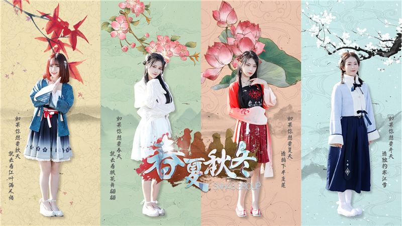 《春夏秋冬》整支MV采用了高饱和度暖色调,传统气息浓厚的建筑装饰、搭配成员们的着装发饰,古风气息扑面而来,契合度十足。MV由一张黑白照片渐渐幻化出颜色而展开,一句“我在这里,等你很久了”揭开了尘封已久的故事。