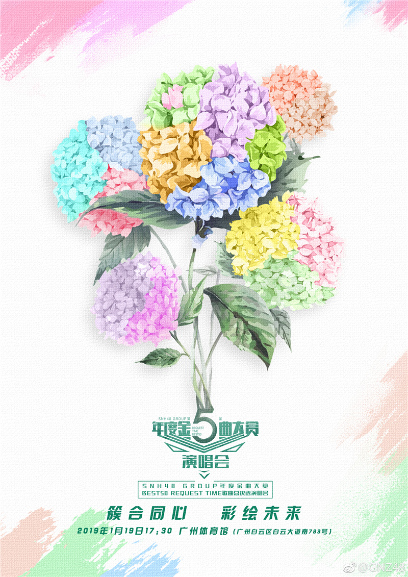 2019年1月19日17:30,第五届SNH48年度金曲大赏演唱会将在广州体育馆燃情开唱!届时,SNH48、BEJ48、GNZ48、SHY48、CKG48五团成员汇聚羊城,联袂演出,倾力为观众打造一场精彩绝伦的视听盛宴。现场还将揭晓由粉丝票选出的SNH48 GROUP年度最受欢迎50首金曲和演出阵容,更有全新7人小组合的华丽诞生!期待与您共同见证荣耀时刻!